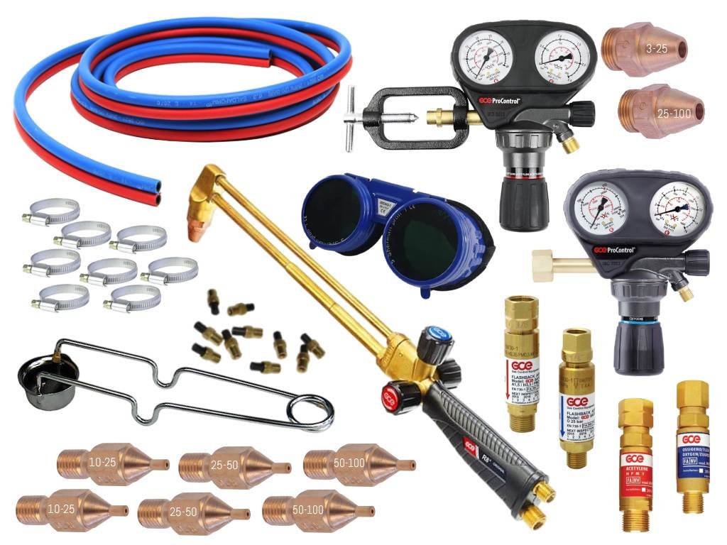 A készlet minden szükséges felszerelést tartalmaz az azonnali használathoz, csak csatlakoztassa a palackokhoz, és már dolgozhat is. A készlet tartalmaz egy GCE R8 AC vágófeltéttel ellátott fogantyút, GCE fűtő- és vágófúvókákat, GCE PROCONTROL oxigén- és acetiléncsökkentő szelepeket, GCE száraz sablonokat, 15 méter dupla tömlőt és tömlőbilincseket, öngyújtót egy csomag tartalék tűzkővel és hegesztőszemüveget.