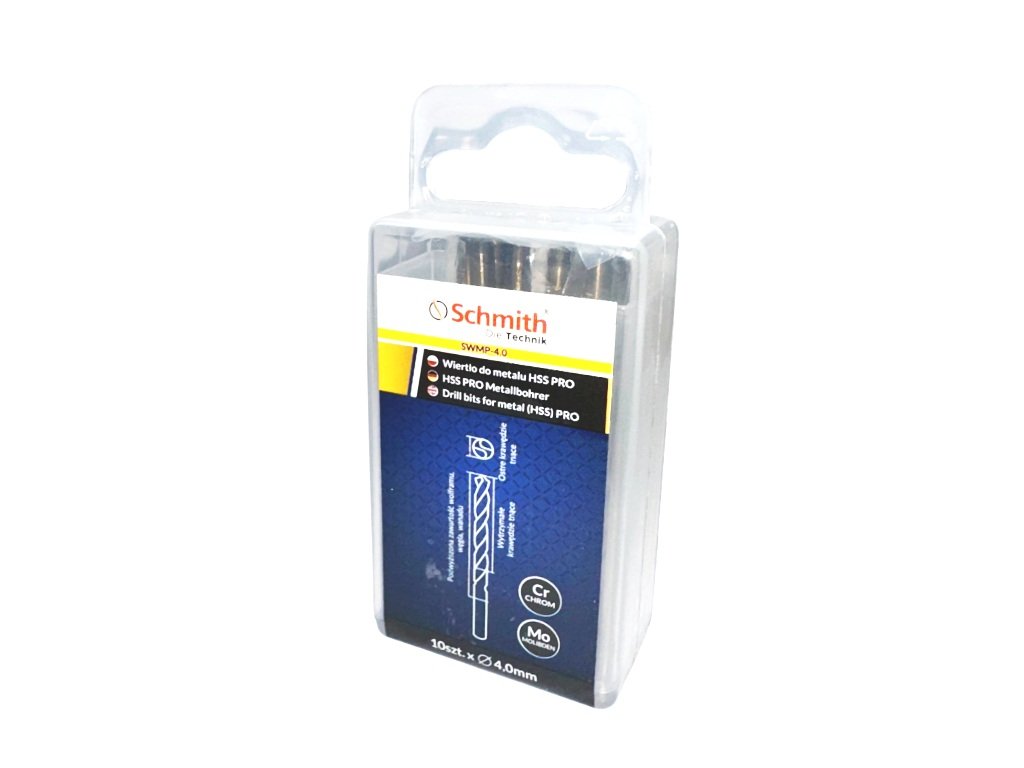 Professzionális fémfúrófej HSS PRO 4 mm Schmith megerősített maggal, hosszú távú munkához igazítva. Egyedi kialakításának köszönhetően ellenáll a kissé edzett fémötvözetekbe fúrt furatok során fellépő kinetikus erőknek. A fúró acél, színesfémek és műanyagok furatainak fúrására szolgál.