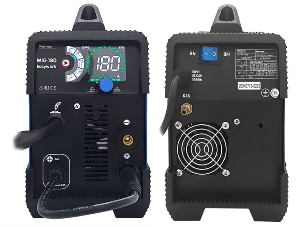 Set Sherman MIG 180 Easywork szinergikus hegesztő egy könnyen használható készülék acél és színesfémek kézi hegesztéséhez MMA (bevonatos elektróda), TIG Lift és MIG/MAG módszerekkel.