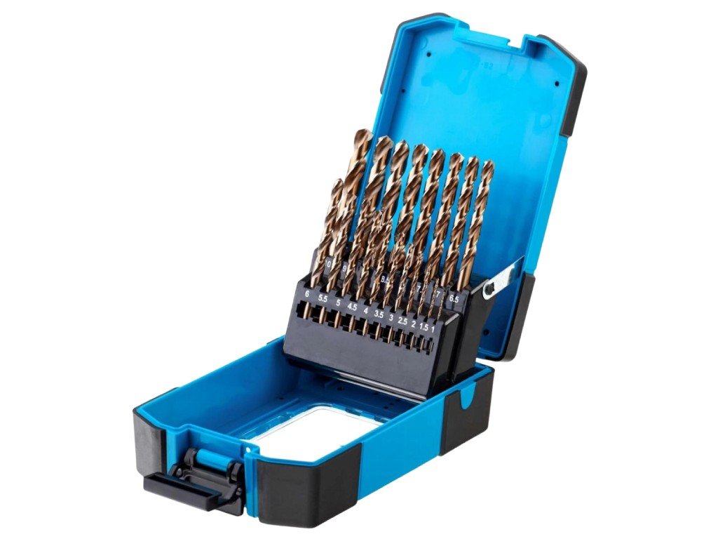 Kobalttal dúsított acélötvözetből készült HSS fúrókészlet. Kivételes tartósság jellemzi őket, amely lehetővé teszi edzett acélötvözetek megmunkálását. A fúrók hornyai további oxigénes felületkezeléssel rendelkeznek, ami kiváló forgácseltávolítást biztosít. Saválló, rozsdamentes, hőálló acél és öntöttvas megmunkálására tervezték őket.